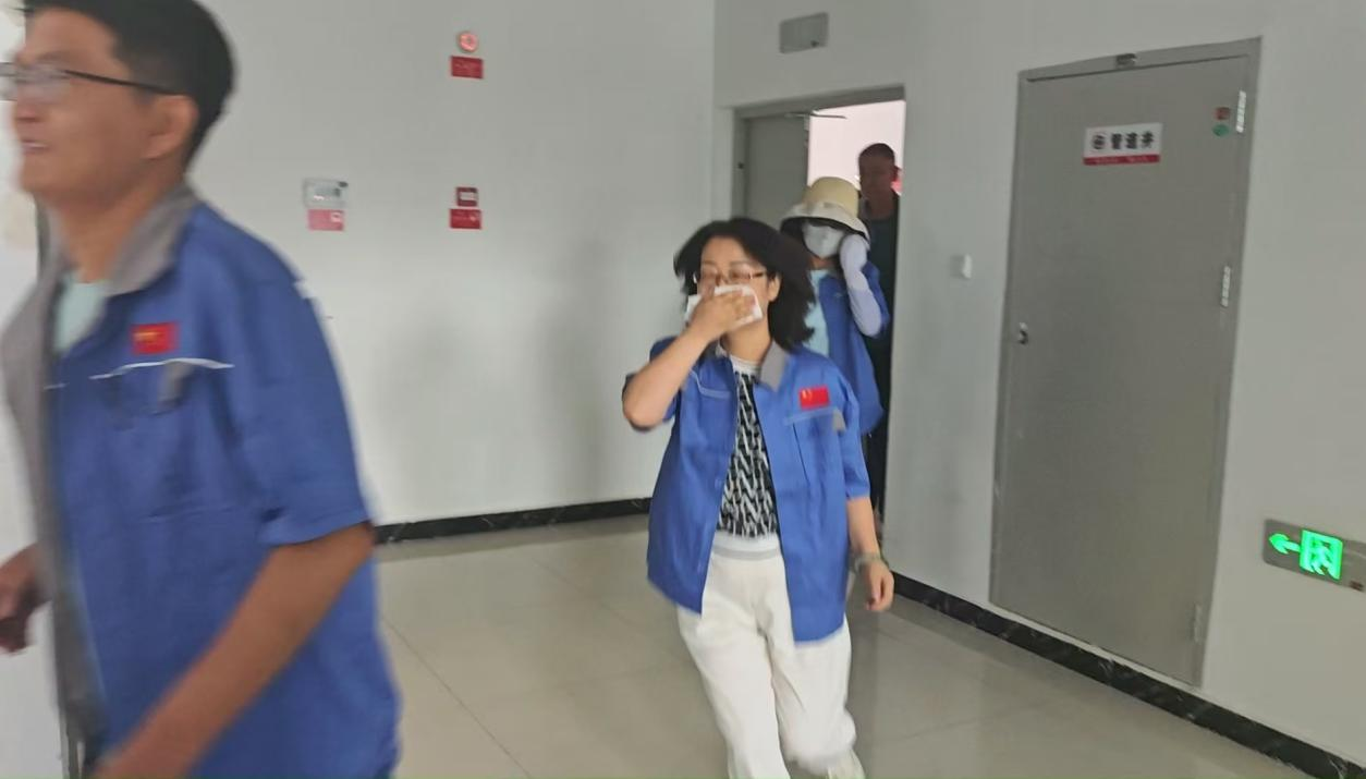 接到疏散指令后,各部门员工在疏散引导组的指引下,用湿毛巾捂住口鼻,低姿弯腰,按照预定的疏散路线快速、有序地撤离至指定的“人员疏散集结点”。